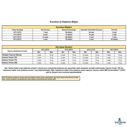 - Diğer: Maksimum performansın elde edilmesi için kürleme sıcaklığı 10°C/50°F’nin üzerinde olmalıdır. Önerilen kalınlığın üzerinde uygulama yapmayın, aksi takdirde kaplama içinde solvent kalabilir.
