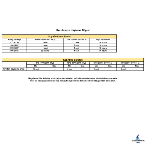 Film kalınlığı ve yayılma oranı uygulama yöntemine bağlıdır, belirlenen film kalınlığına ulaşmak için daha fazla katman gerekebilir. Değerler rulo uygulaması esas alınarak verilmiştir.