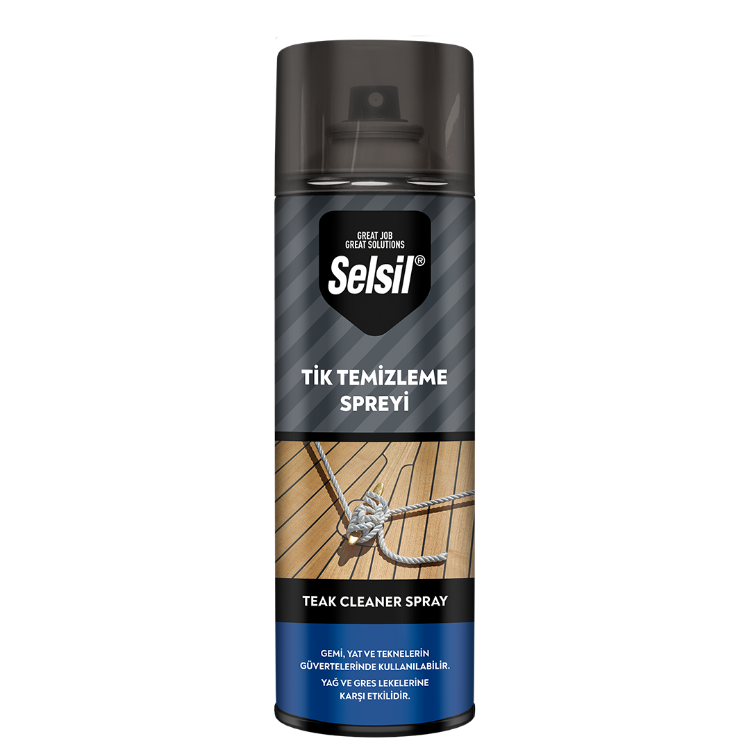 Selsil Tik Temizleme Spreyi, gemi, yat ve teknelerin güvertelerindeki tik ağacından yapılmış döşemelerin üzerinde meydana gelen yağ, gres, kir ve çeşitli lekelerin tik üzerinden kolayca temizlenmesi için geliştirilmiş bir leke çıkarıcı spreydir.